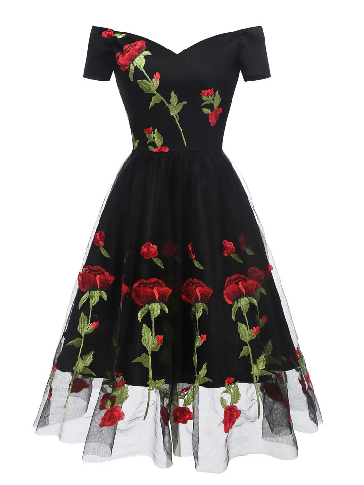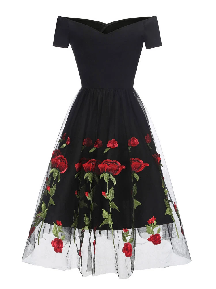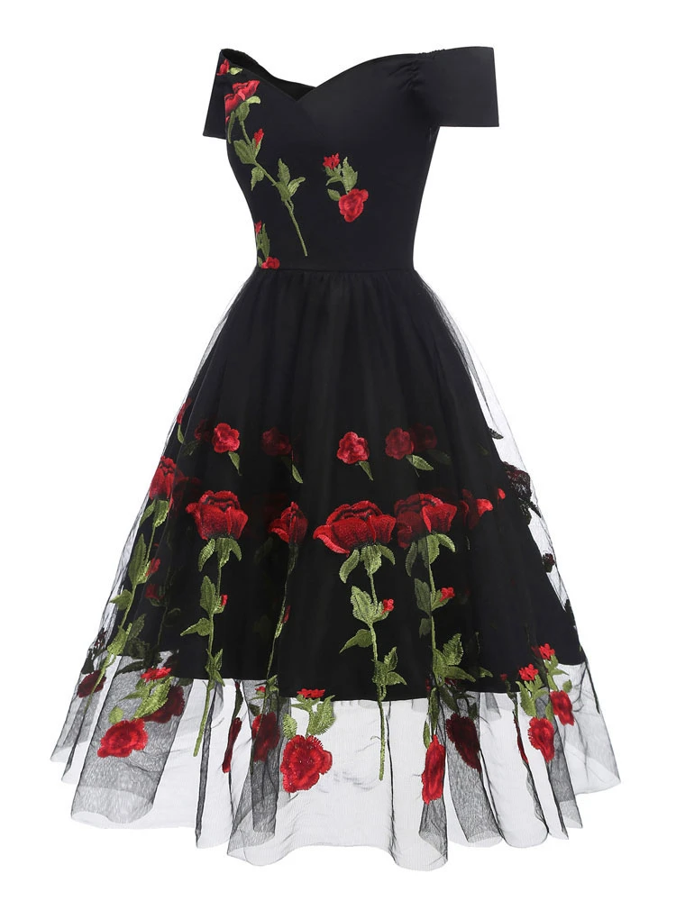 Black 1950s Audrey Hepburn Style Off The Shoulder Flower Embroidered Tulle Vintage Dress