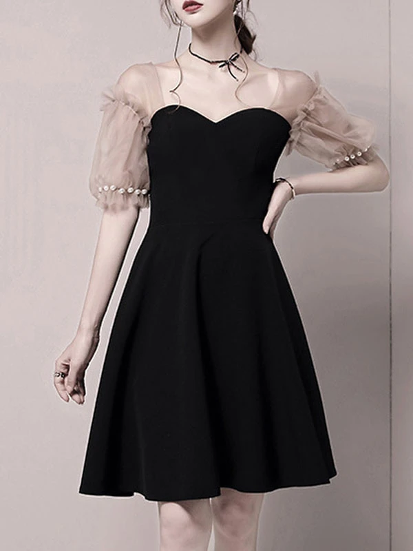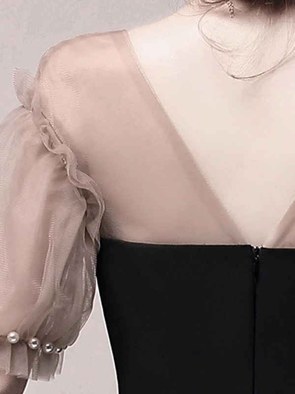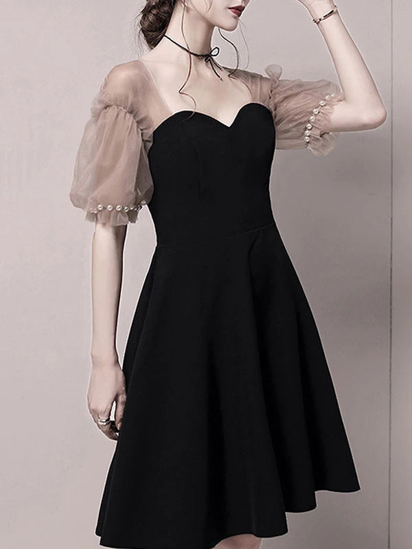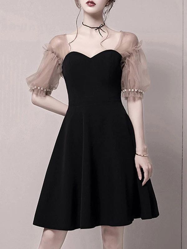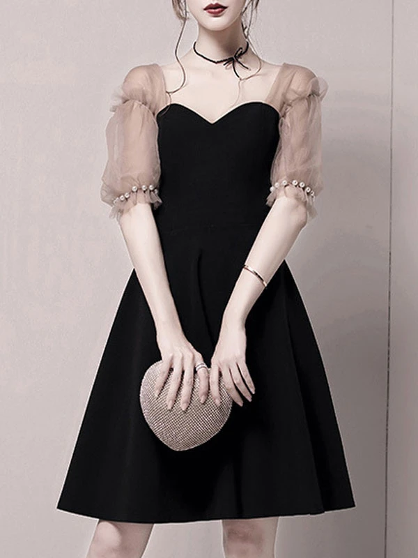 Black Evening Dress Ball Gown Sweetheart Neck Knee-Length Half Sleeves Zipper Beaded Stretch Crepe Formal Dinner Dresses