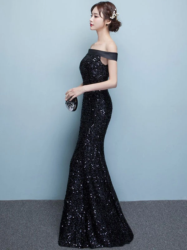 Black Evening Dress Lace Sequin Bateau Mermaid Formal Dress Off The Shoulder Floor Length Occasion Dress Wedding Guest Dress