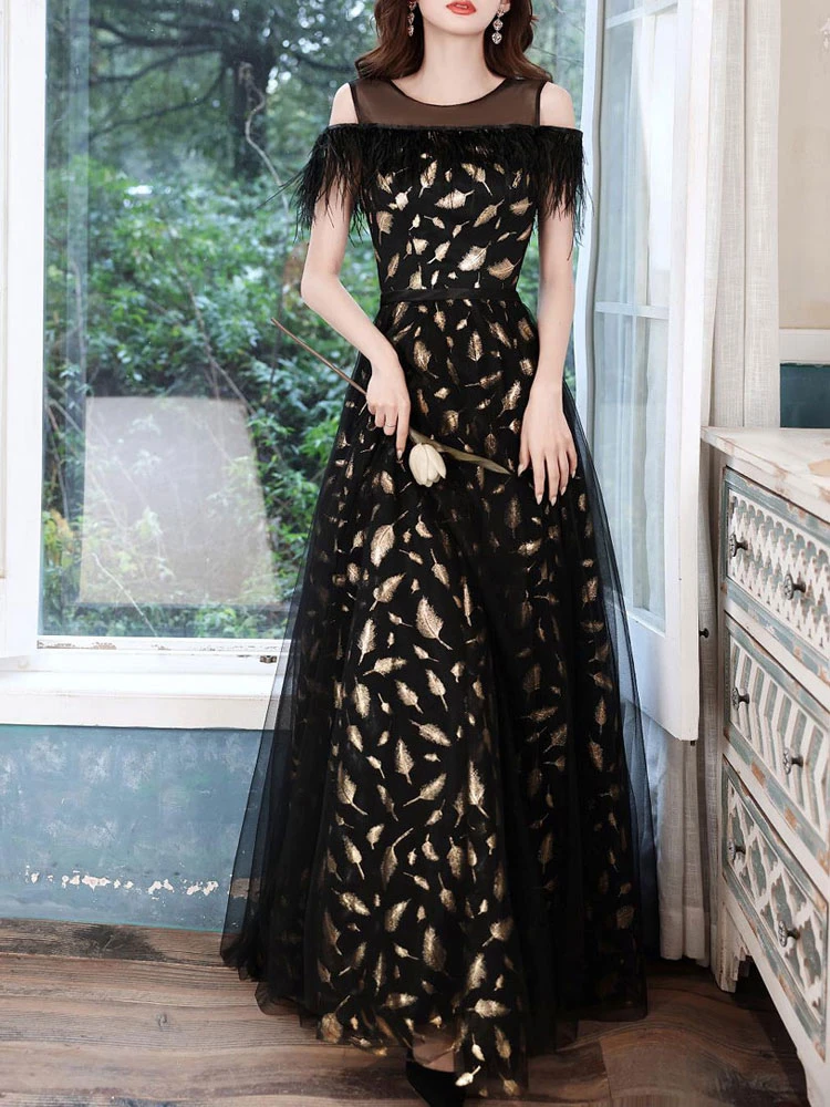 Black Prom Dress 2023 A-Line Jewel Neck Lace Floor-Length Feathers Pageant Dresses Wedding Guest Dresses