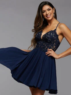 Blue Homecoming Dress 2023 Short V-Neck Applique Lace Up Spaghetti Strap Graduation Party Outfits Free Customization