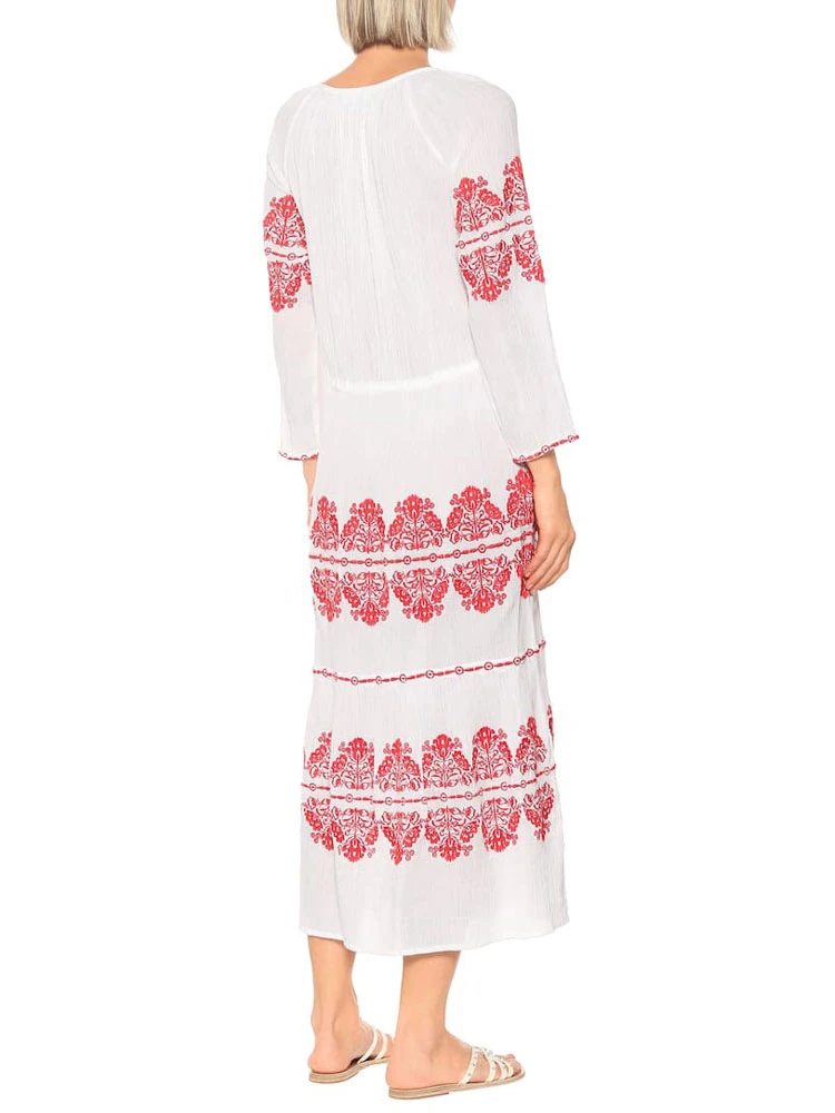 Boho Dress White Crewneck Long Sleeve Bohemian Gypsy Embroidered Vacation Spring Fall Long Beach Dress For Women