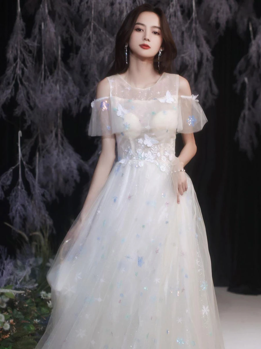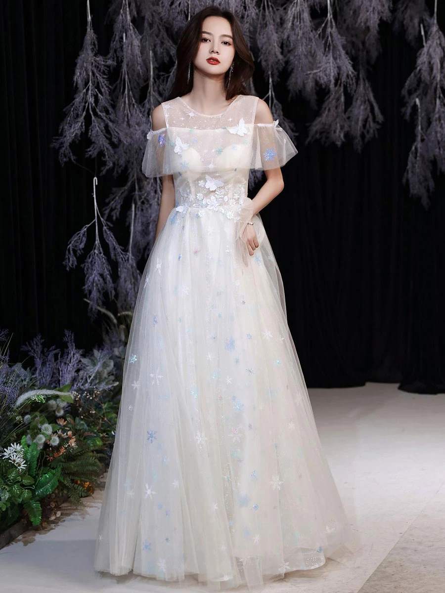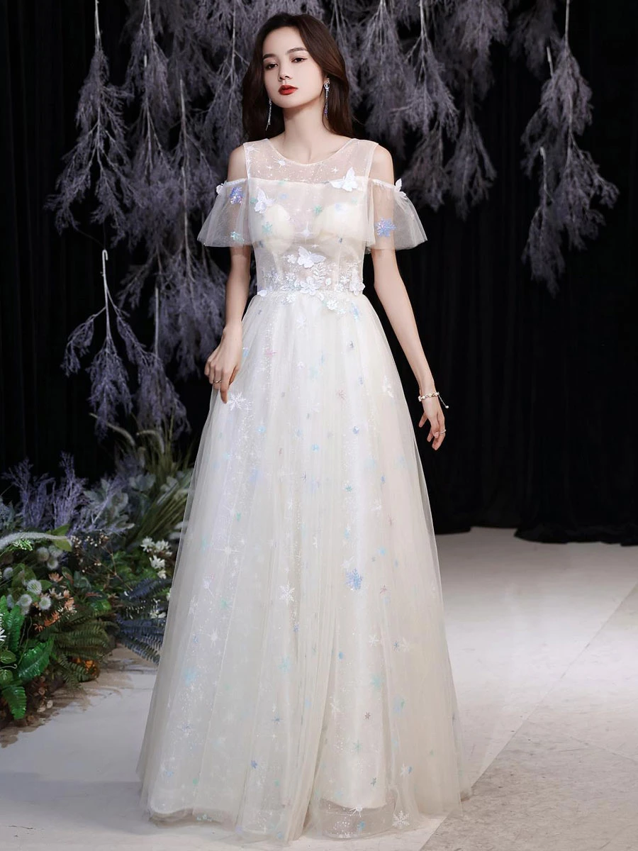 Champagne Prom Dress 2023 A-Line Jewel Neck Half Sleeves Zipper Butterfly Floor-Length Formal Lace Party Dresses