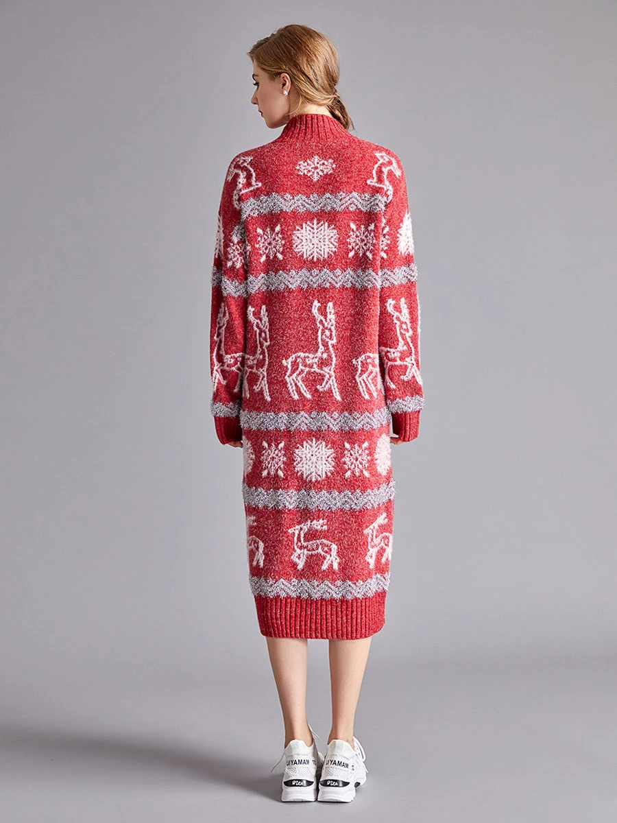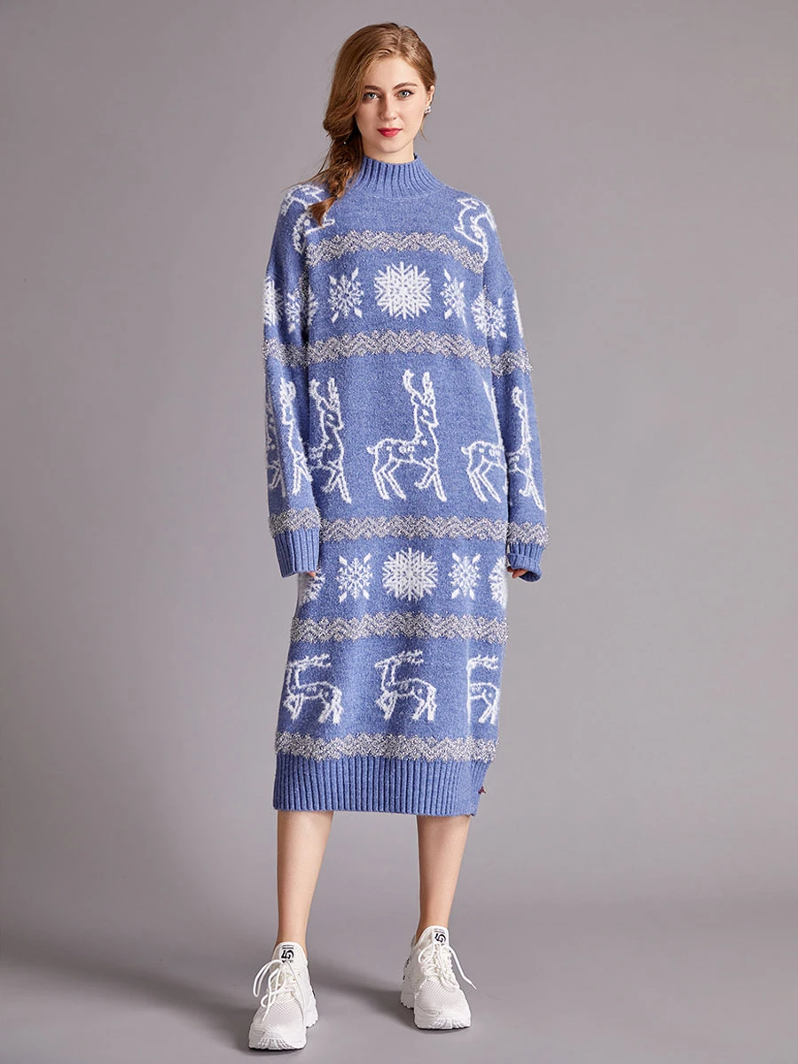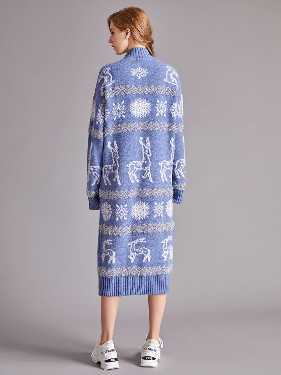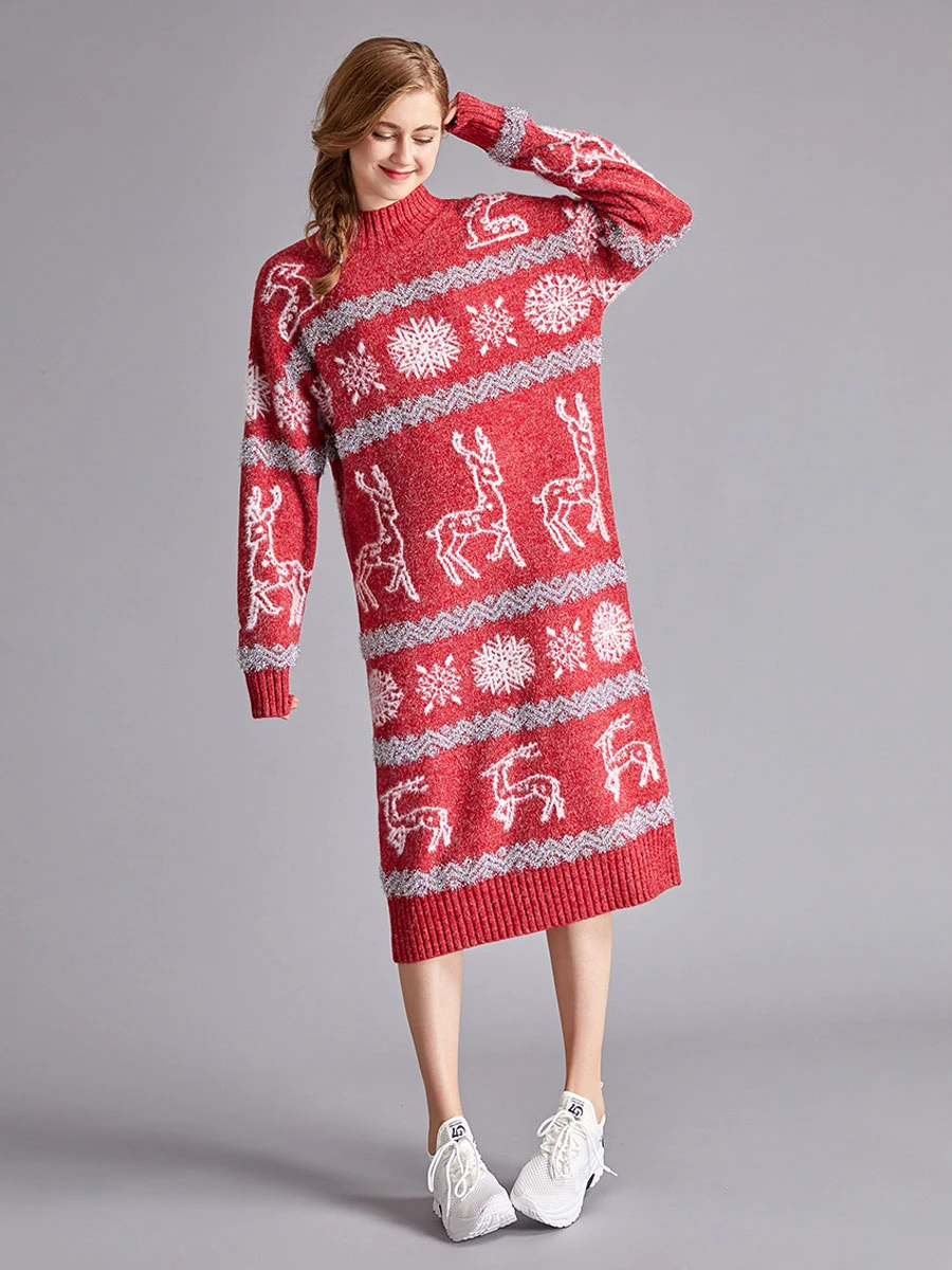 Christmas Knitted Dress For Women Fashion Animal Print Acrylic Long Sleeves High Collar Winter Dresses