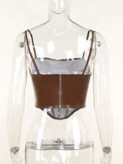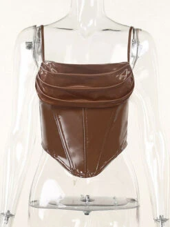 Coffee Brown Cami Top Straps Neck Pleated PU Leather Backless Casual Women Camis