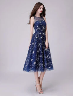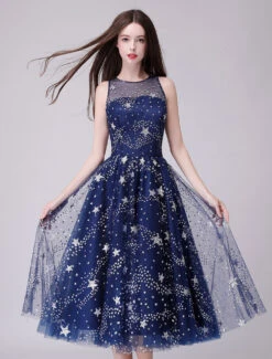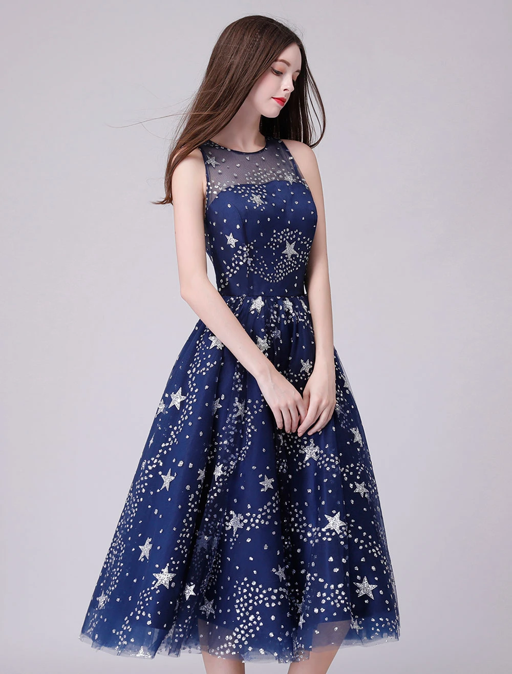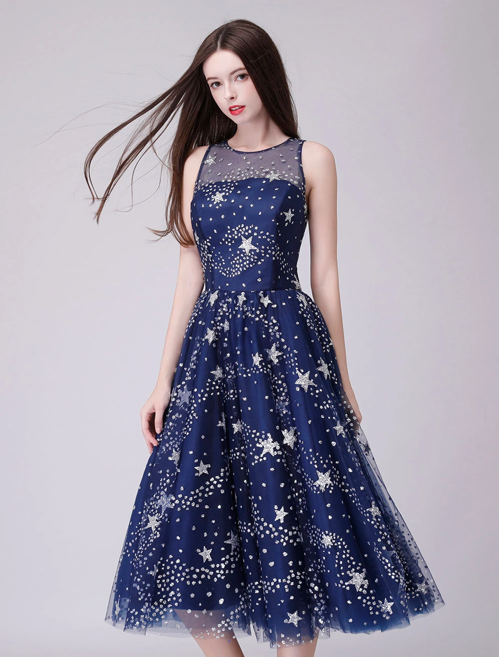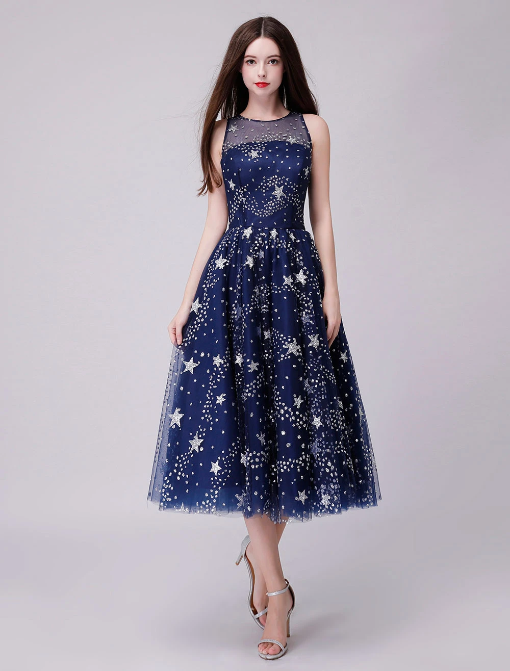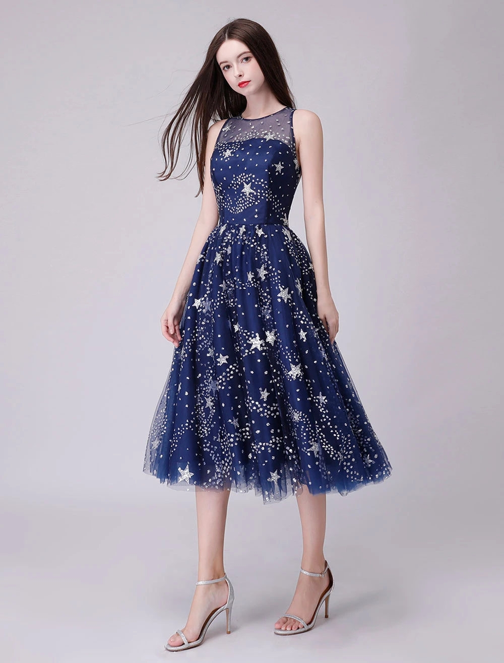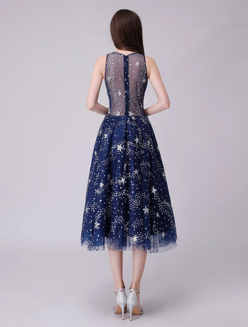 Dark Navy Cocktail Dress Lace Sleeveless Stars Tea Length Graduation Party Dress Wedding Guest Dresses
