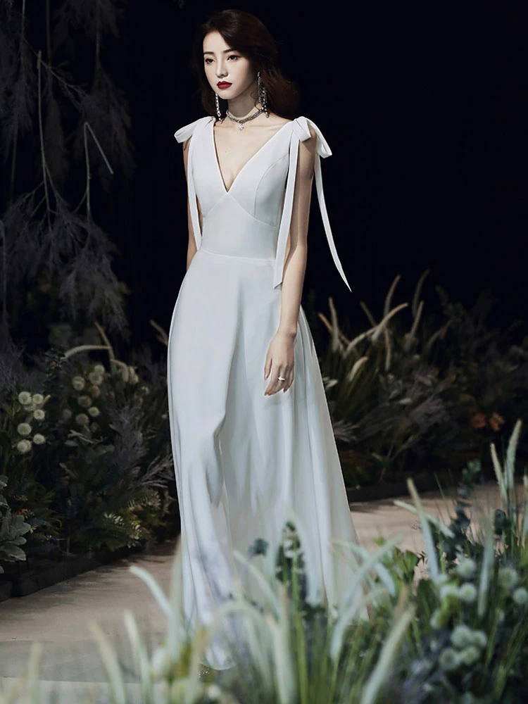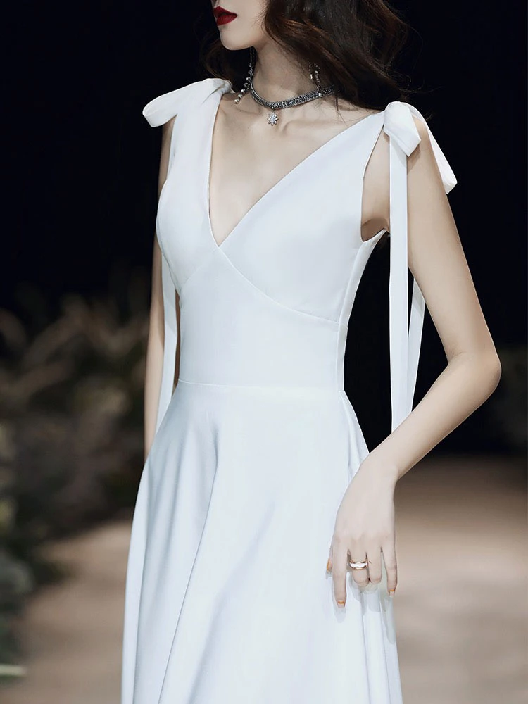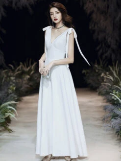 Evening Dress A-Line V-Neck Floor-Length Sleeveless Zipper Bows Satin Fabric Prom Dress