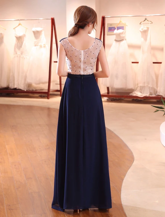 Evening Dresses Dark Navy Lace Formal Dress Illusion Beaded Contrast Color Floor Length Wedding Guest Dress