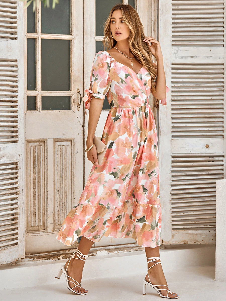 Floral Dress V-Neck Short Sleeves Casual Printed Midi Dress