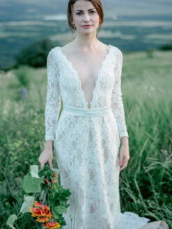 Be the first to review “Ivory Lace Wedding Dress With Train A-Line Long Sleeves V-Neck Bridal Gowns Free Customization” Cancel reply