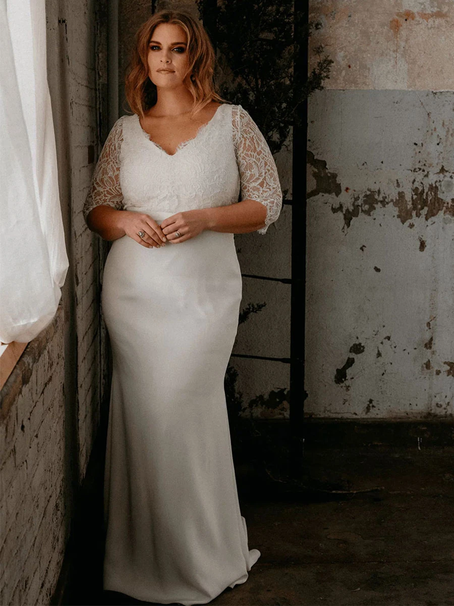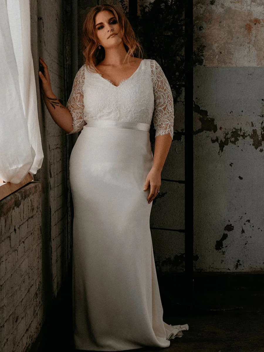 Ivory Plus Size Wedding Dresses 2023 With Train 3/4 Length Sleeves V-Neck Bridal Dresses Free Customization