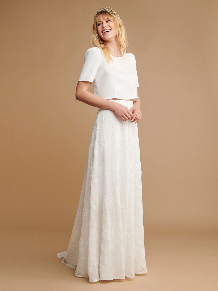 Ivory Two-piece Wedding Dress Sets Lace Jewel Neck Functional Buttons Short Sleeves A-Line With Train Bridal Dress Free Customization