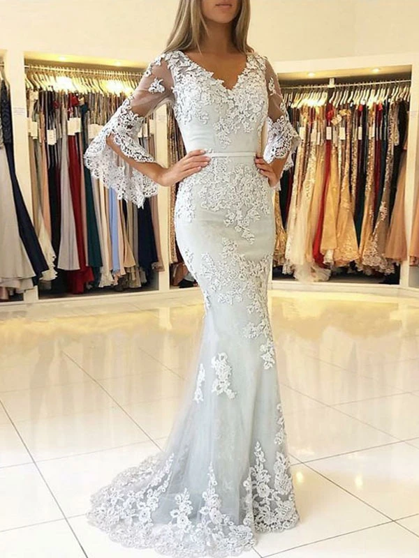 Lace Evening Dress Ivory V Neck Long Sleeve Floor Length Formal Dress Mermaid Party Dresses