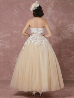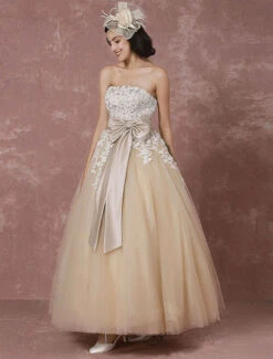 Lace Wedding Dress Tulle Champagne Bridal Gown With Shrug Cape Ball Gown Strapless Sweetheart Ribbon Bow Sash Ankle Length Bridal Dress Milanoo