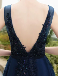 Long Prom Dress 2023 Dark Navy V Neck Backless Lace Beading A Line Tulle Formal Dresses Wedding Guest Dresses