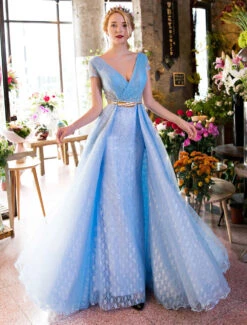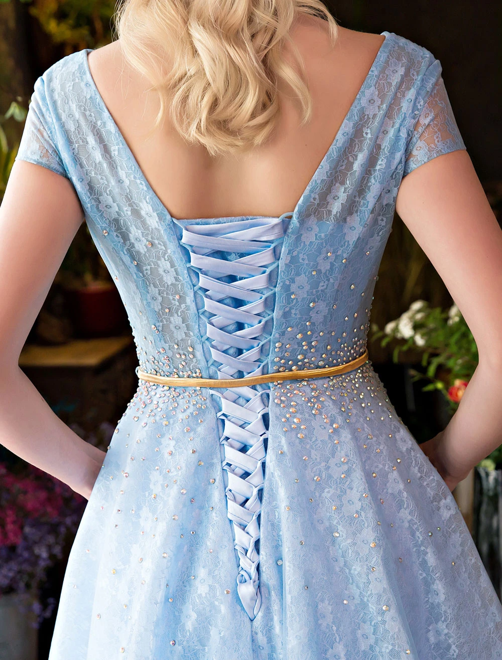 Long Prom Dresses Luxury V Neck Rhinestones Beading Cap Sleeve Pleated Lace Tulle Baby Blue Formal Evening Dresses