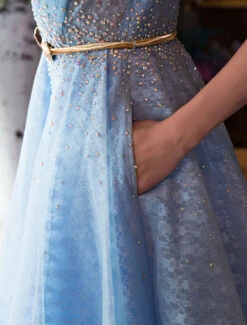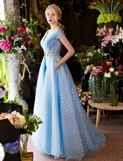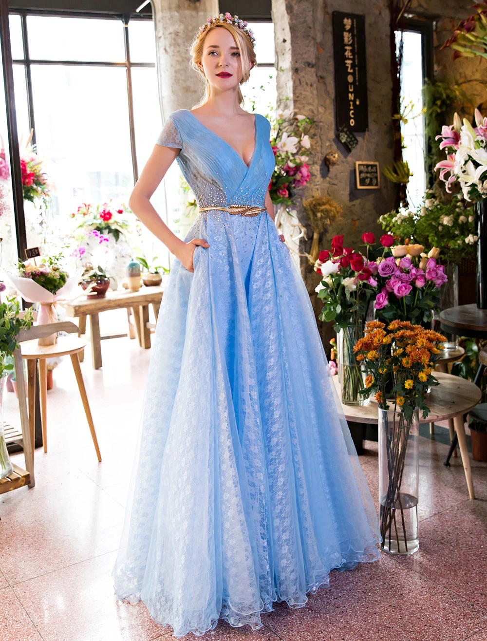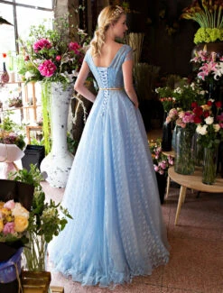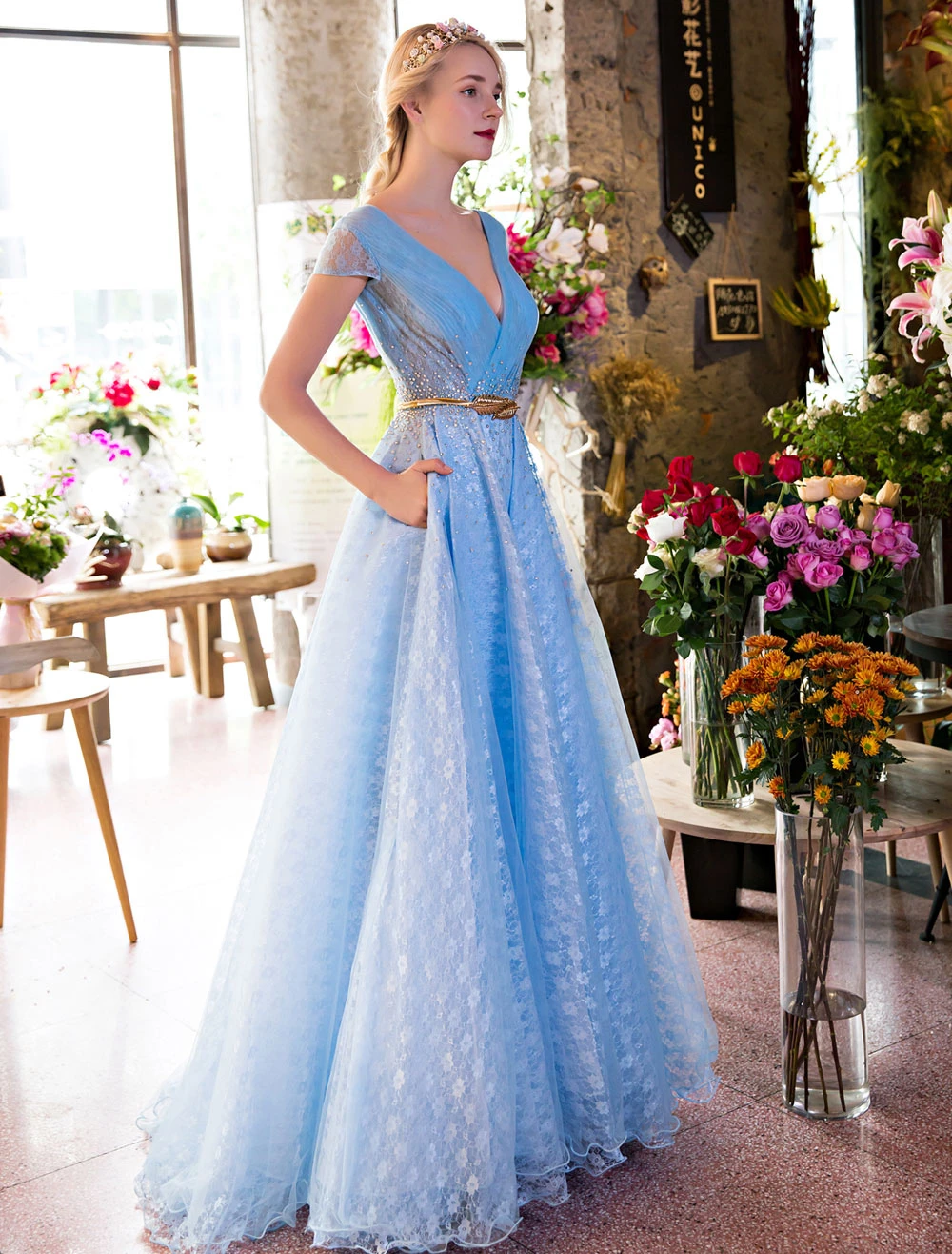 Be the first to review “Long Prom Dresses Luxury V Neck Rhinestones Beading Cap Sleeve Pleated Lace Tulle Baby Blue Formal Evening Dresses” Cancel reply