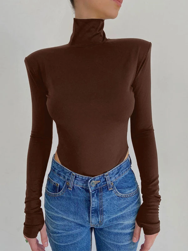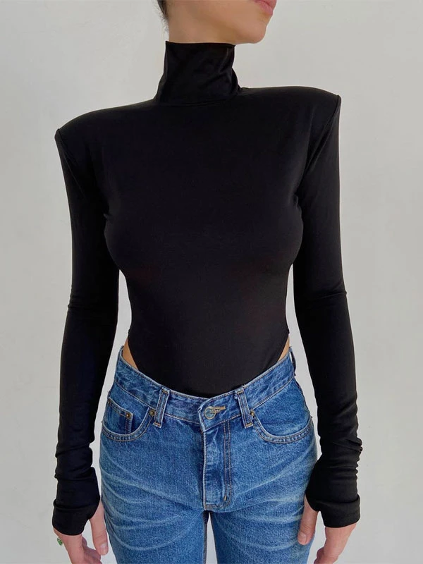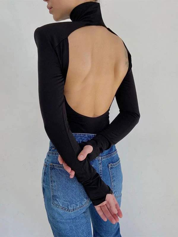 Long Sleeves Bodysuit Black Backless High Collar Sexy Women Top