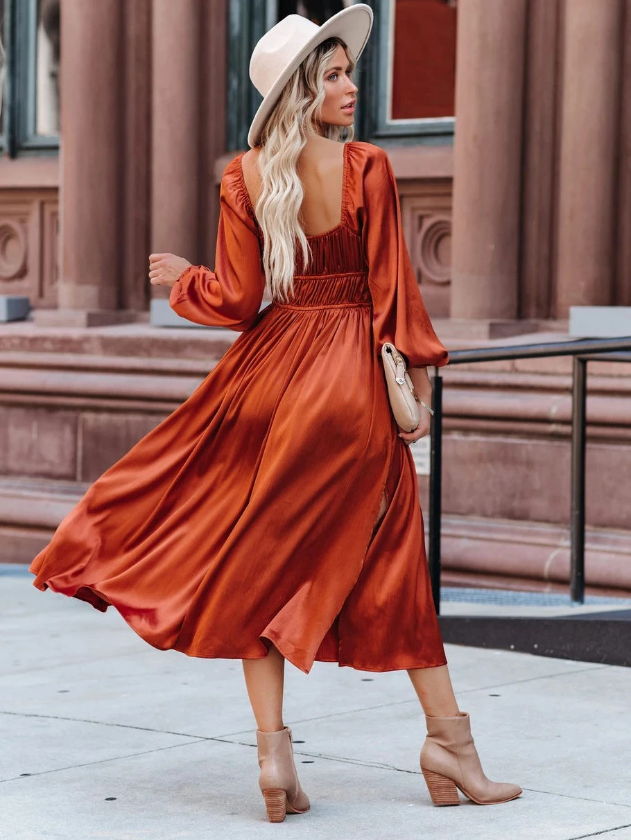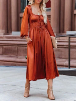 Maxi Dress Square Neck Long Sleeves Orange Red Floor Length Dress