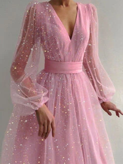 Party Dresses Pink V-Neck Sequins Long Sleeves Sheer Semi Formal Dress
