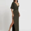 Women Long Dress V-Neck Short Sleeves Floral Print Pattern Pleated Lace Up Layered Maxi Dress