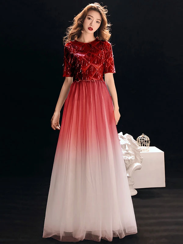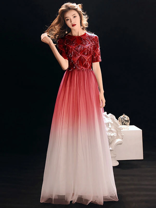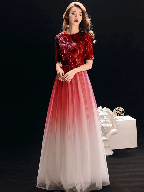 Prom Dress 2023 Red Sequin A Line Crewneck Tassels Short Sleeve Floor Length Formal Party Dresses