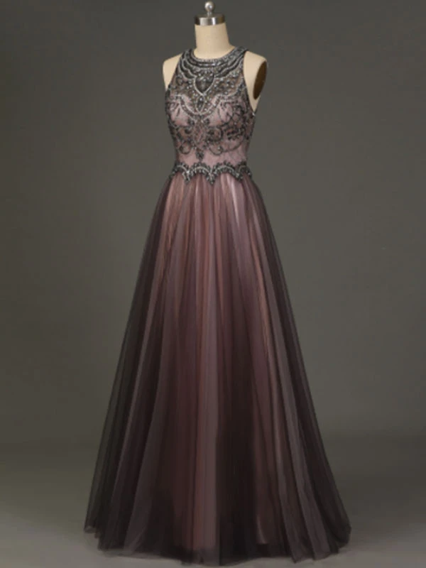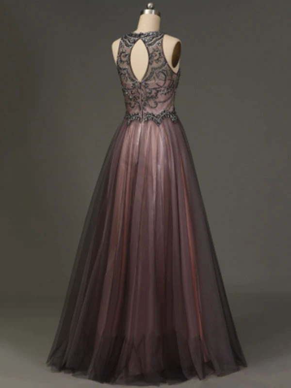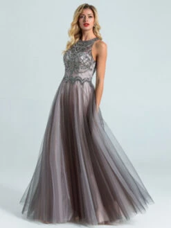 Prom Dress A Line Jewel Neck Tulle Sleeveless Beaded Grey Party Dresses Evening Gown