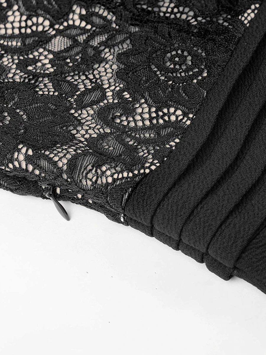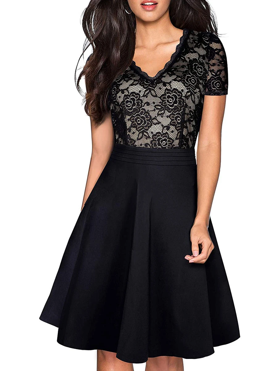 Prom Dress Black Satin Fabric V-Neck A-Line Short Sleeves Lace Knee Length Party Dresses