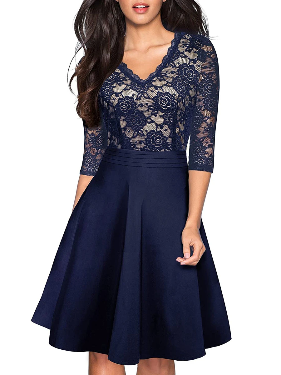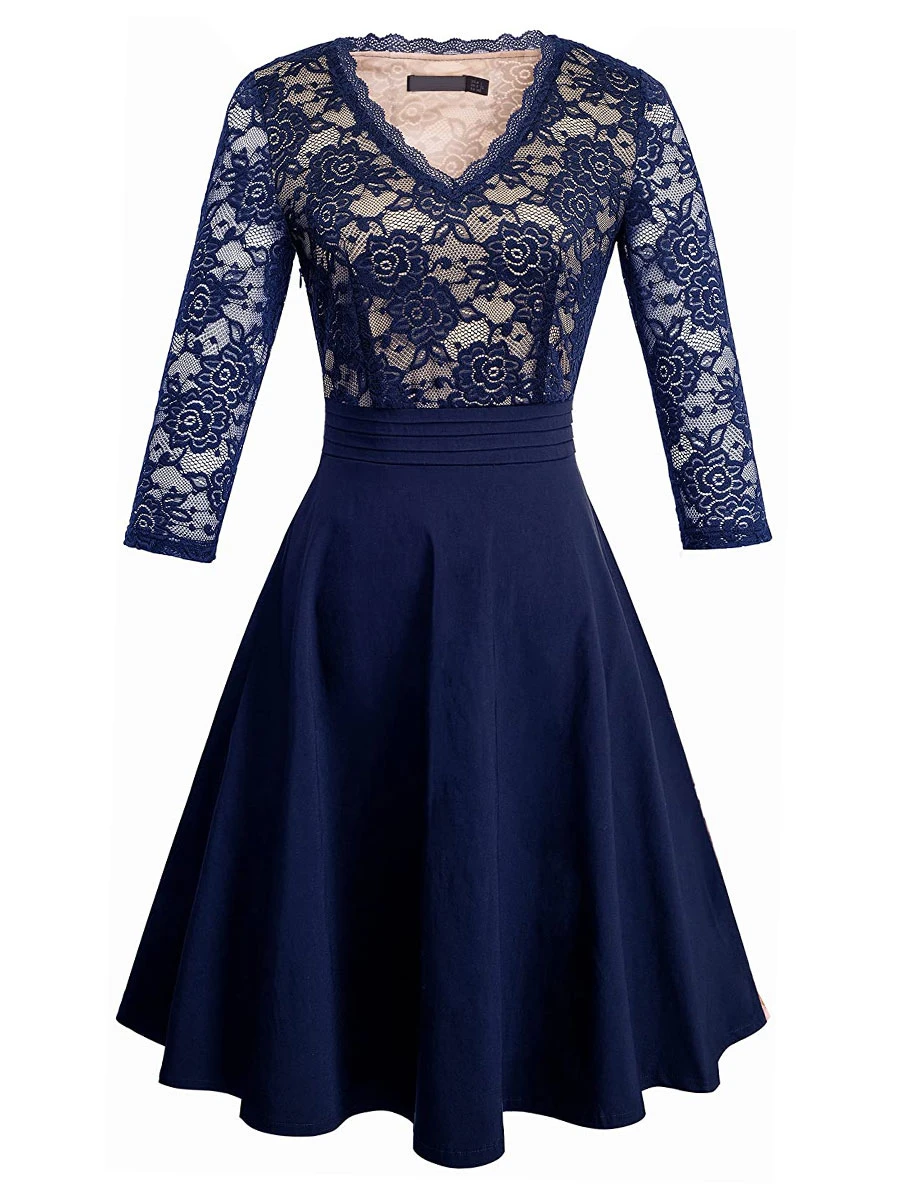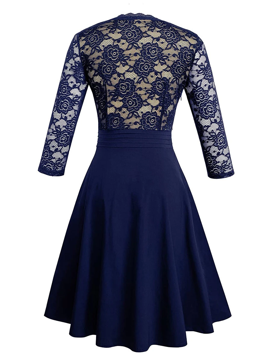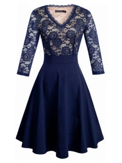 Retro Dress 1950s Audrey Hepburn Style Pink Color Block Woman’s 3/4 Length Sleeves Rockabilly Dress