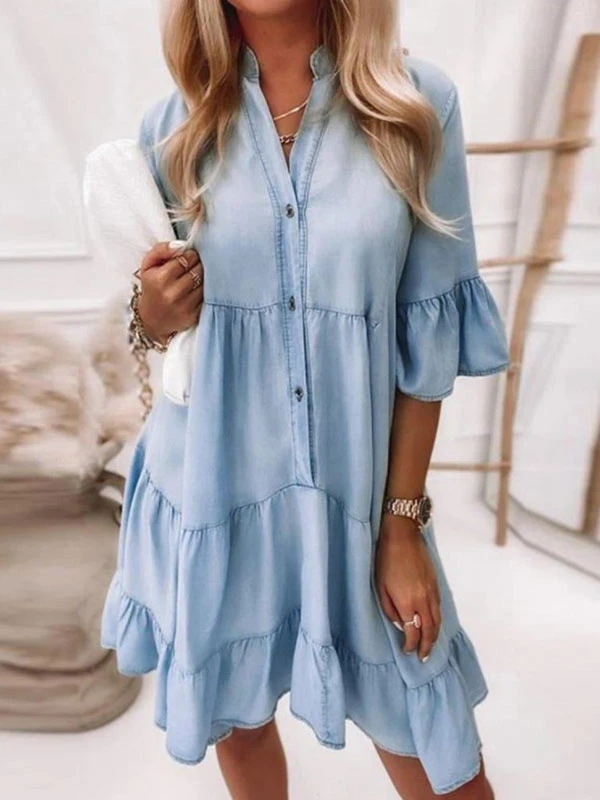 Shift Dresses Light Sky Blue Turndown Collar Denim Layered Woman Tube Dress