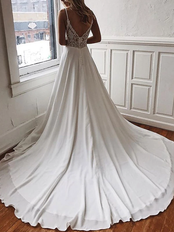 Simple Wedding Dress A Line V Neck Sleeveless Straps Back Lace Boho Bridal Dresses With Train
