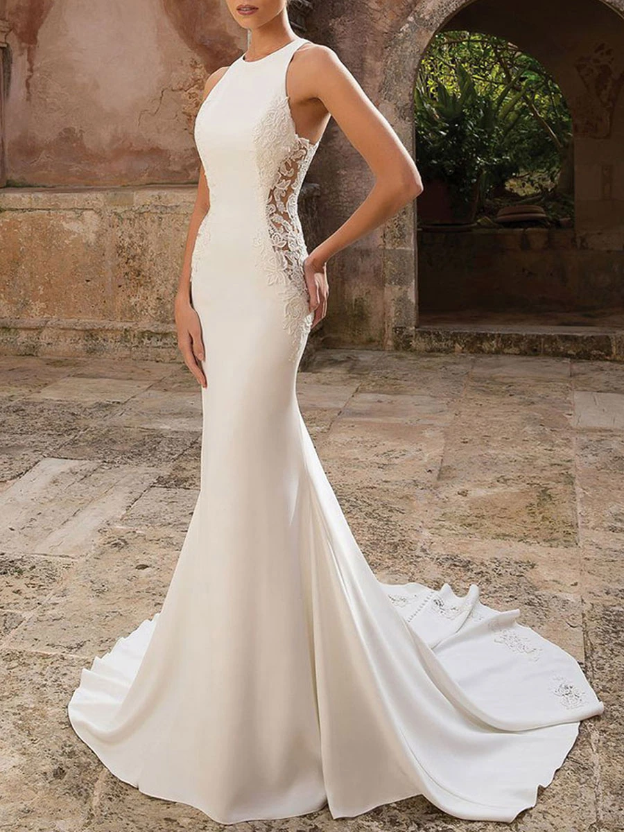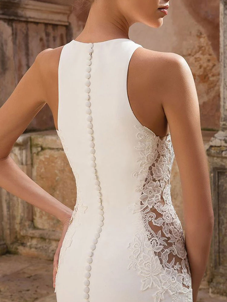 Simple Wedding Dress Lycra Spandex Jewel Neck Sleeveless Lace Mermaid Bridal Dresses