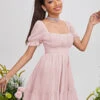 Women Long Dress V-Neck Short Sleeves Floral Print Pattern Pleated Lace Up Layered Maxi Dress