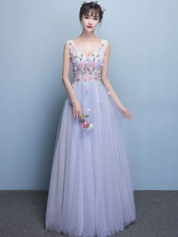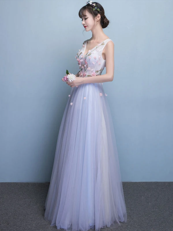 Tulle Prom Dress Baby Blue 3D Flower Occasion Dress V Neck Sleeveless Floor Length A Line Party Dress