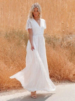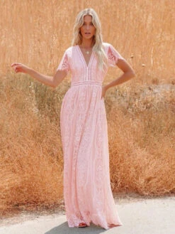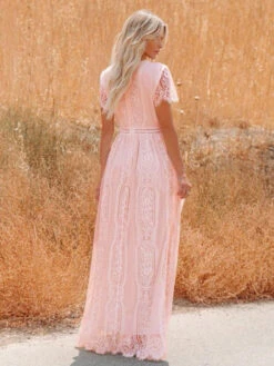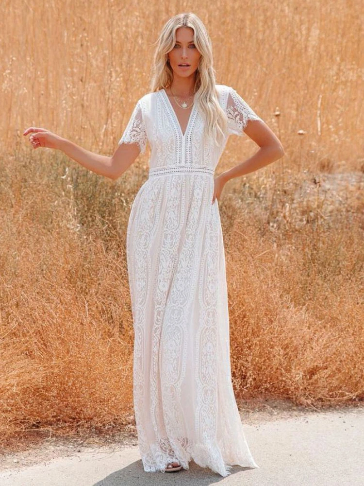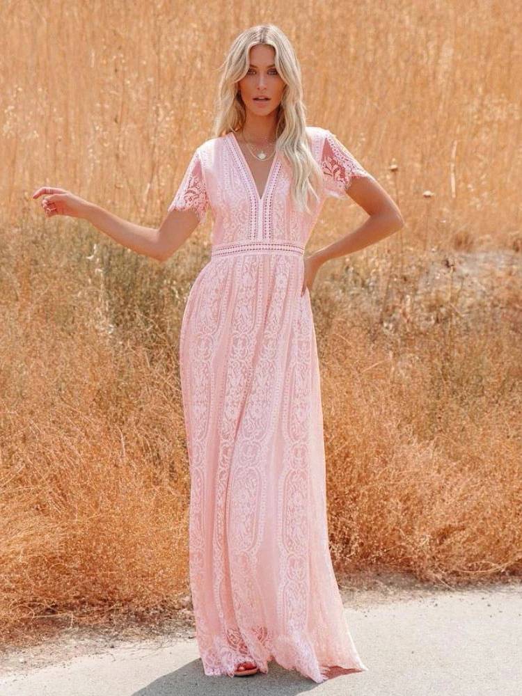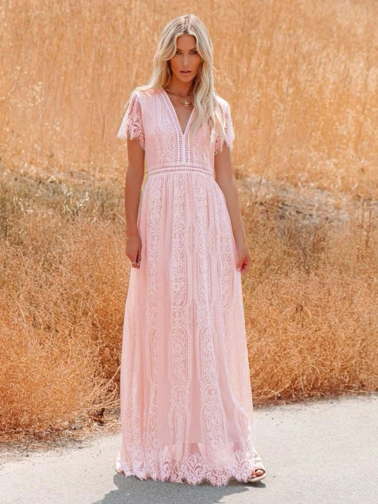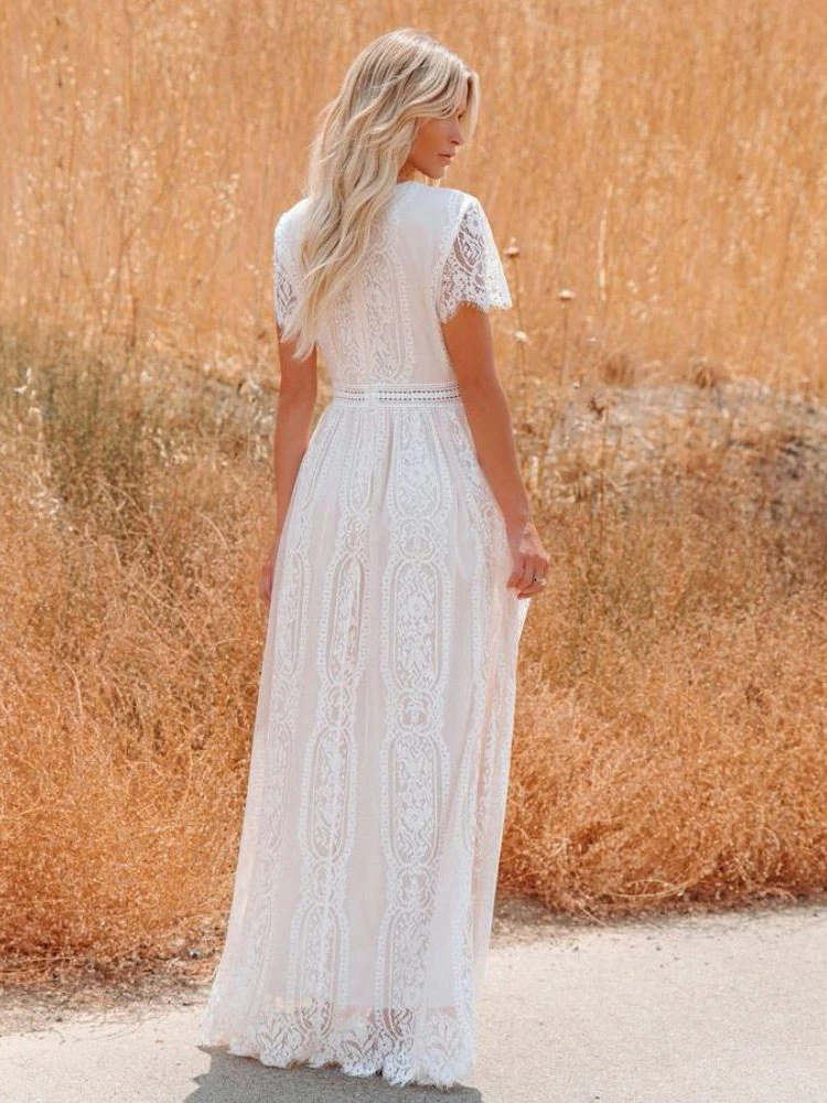 V-Neck Maxi Dress Half Sleeves Lace Bohemian Floor Length Dress