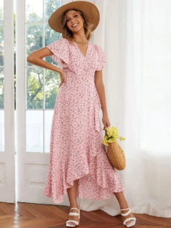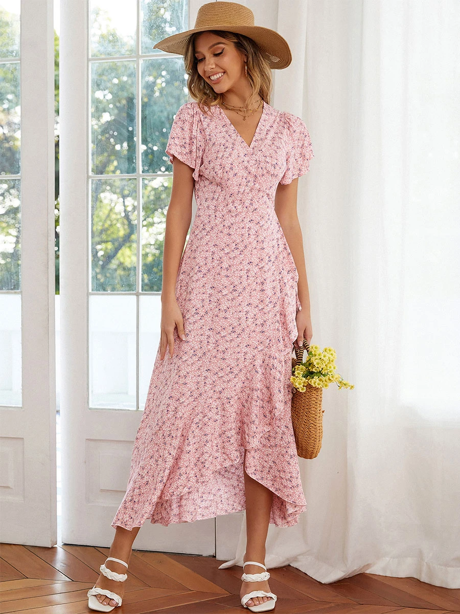 Women Long Dress V-Neck Short Sleeves Floral Print Pattern Pleated Lace Up Layered Maxi Dress