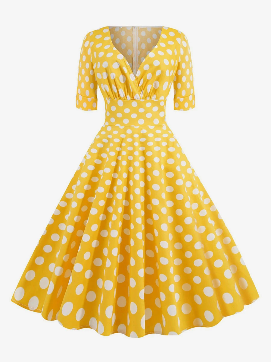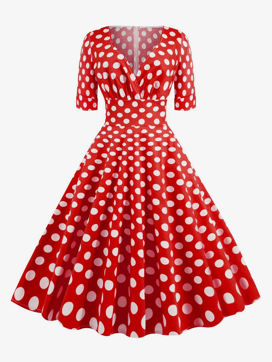 Vintage Dress 1950s Audrey Hepburn Style Red Polka Dot Short Sleeves V-Neck Swing Dress