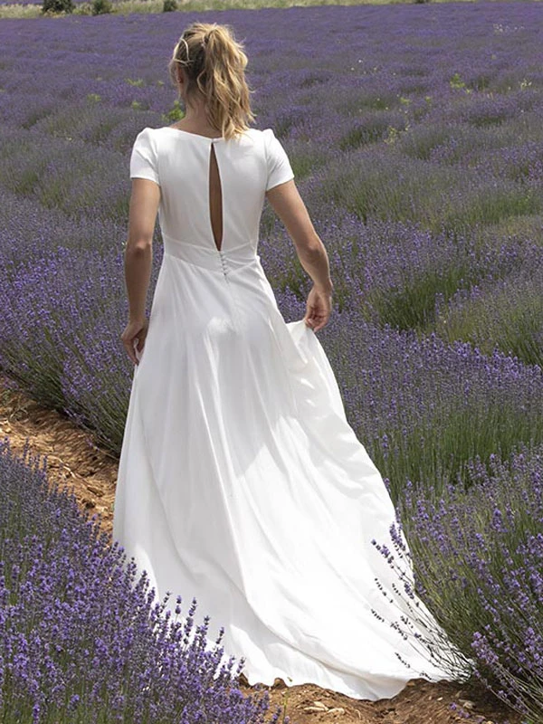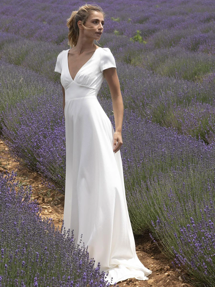 Wedding Dress With Train V Neck Short Sleeves Buttons Floor Length Bridal Dresses