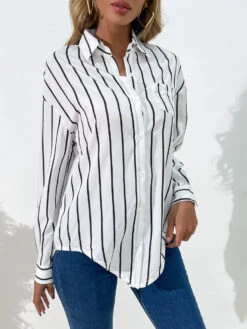 Be the first to review “White Blouse For Women Turndown Collar High Low Design Stripes Pattern Pockets Buttons Long Sleeves Casual Shirt” Cancel reply