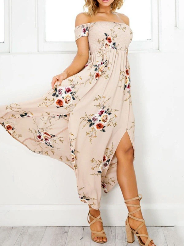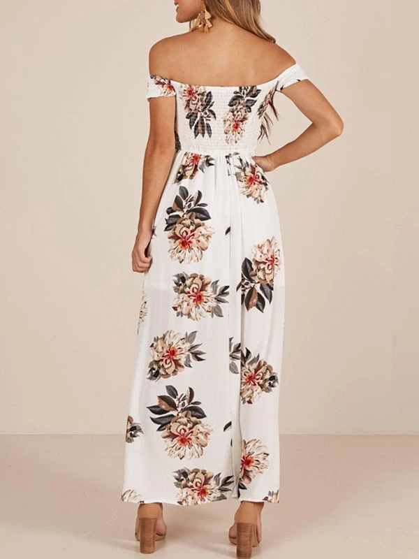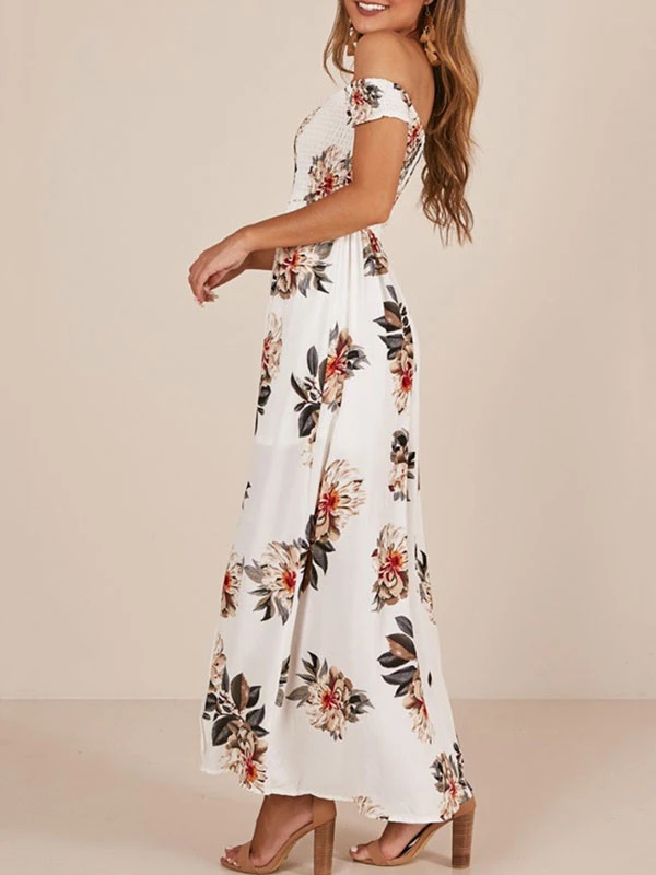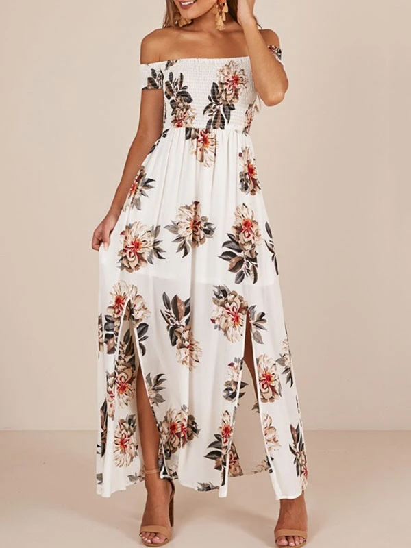 White Floral Maxi Dress Off The Shoulder Short Sleeve Split Chiffon Summer Dress