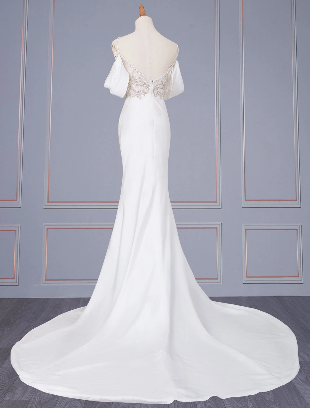 White Mermaid Wedding Dress V-Neck Short Sleeves Backless Lace With Train Long Bridal Dress Free Customization
