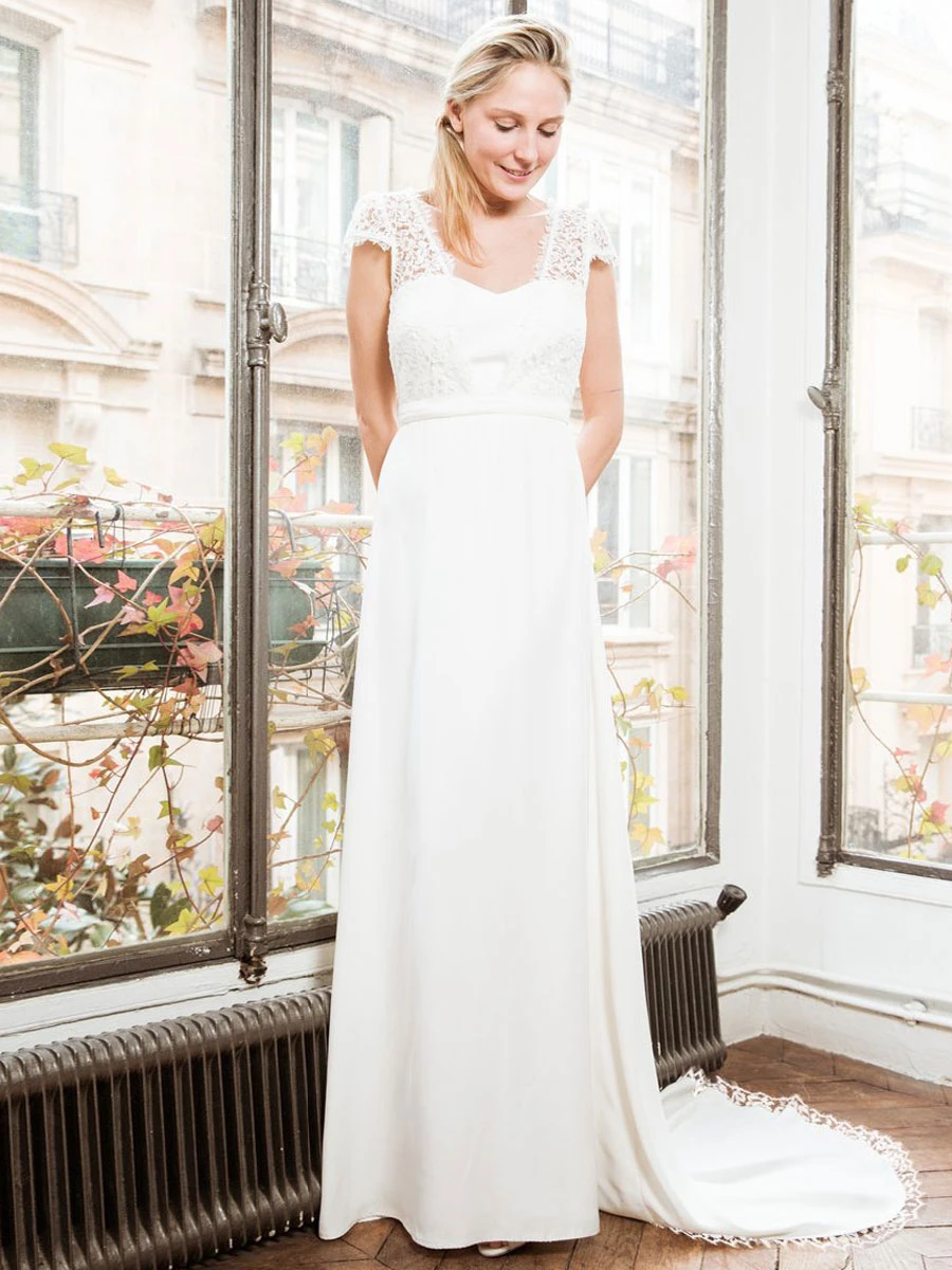 White Simple Causal Wedding Dress A-Line Strapless Backless Short Sleeves Lace Satin Fabric Long Bridal Dresses Free Customization