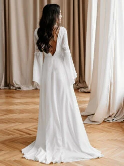 White Simple Causal Wedding Dress With Train A-Line V-Neck Long Sleeves Backless Chains Bridal Gowns Free Customization