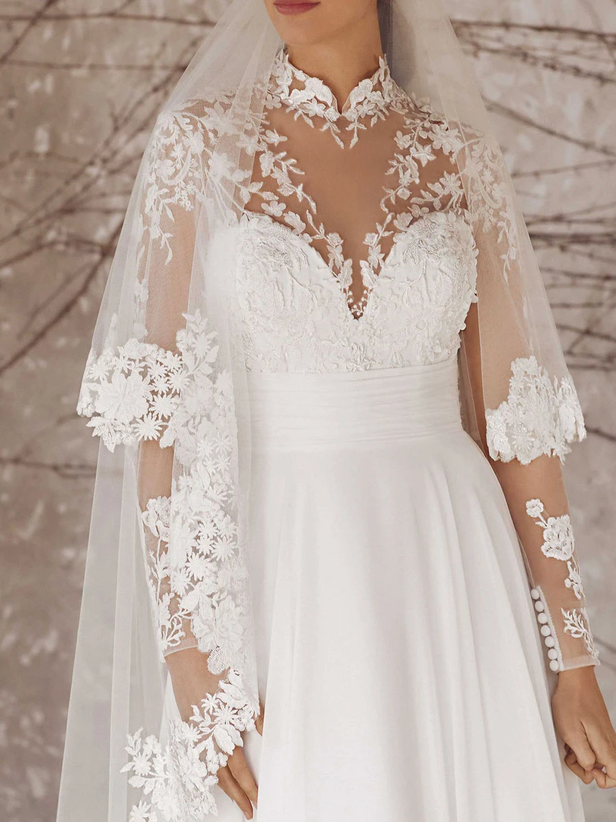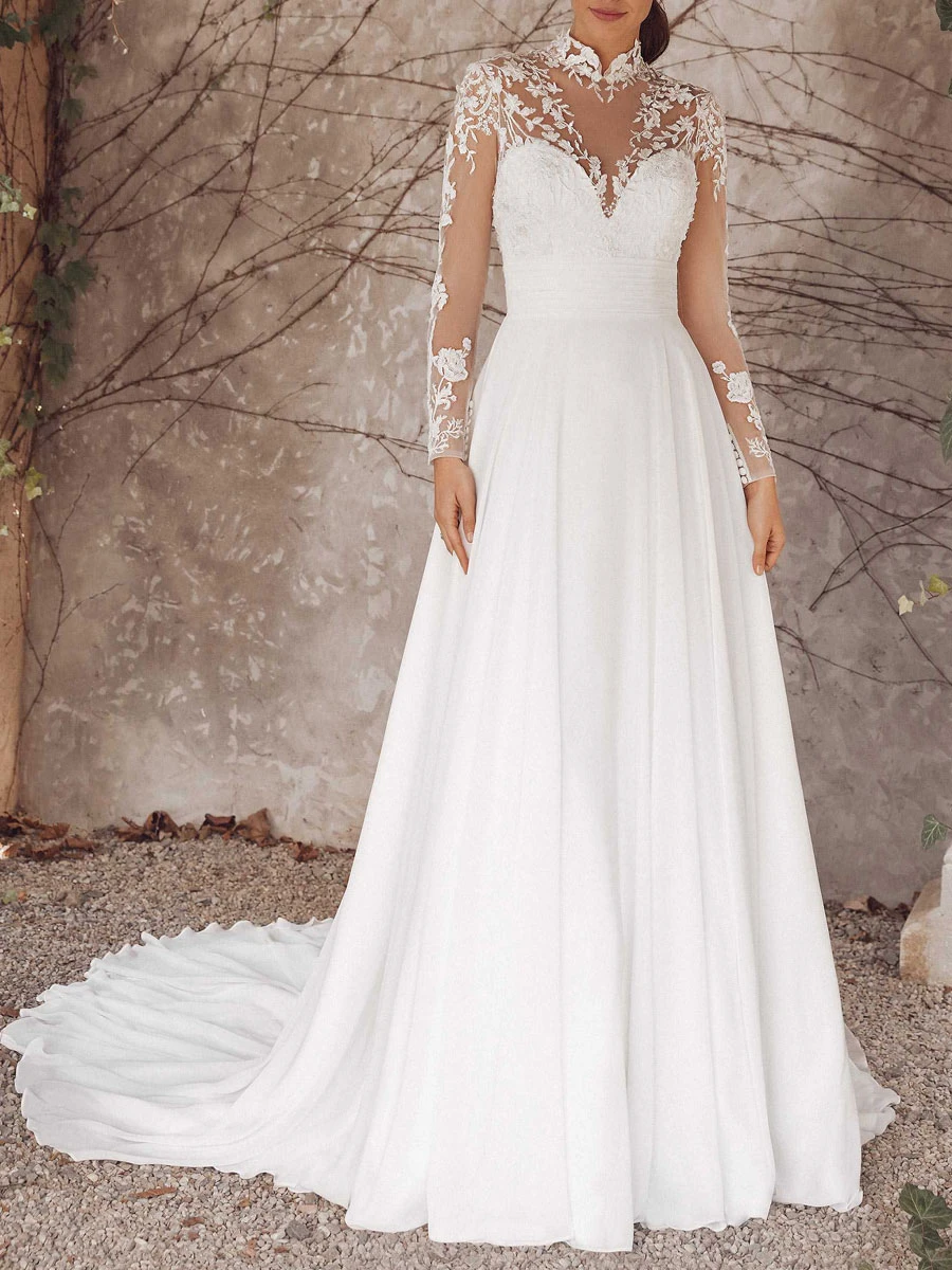 White Simple Wedding Dress With Train High Collar Long Sleeves Lace A-Line Bridal Dresses Free Customization