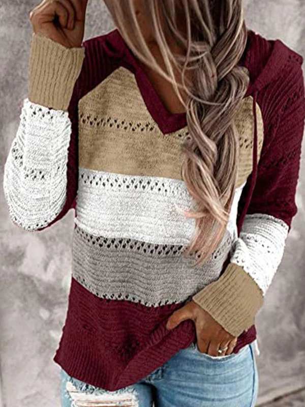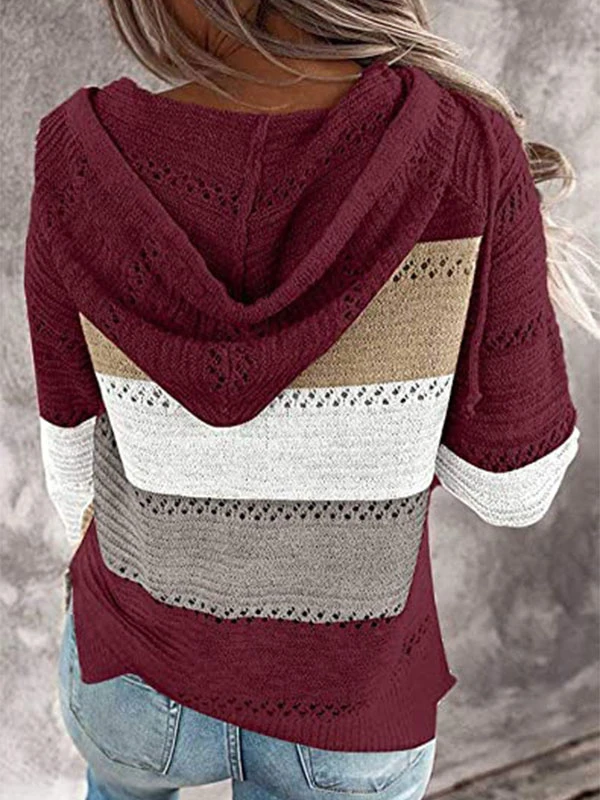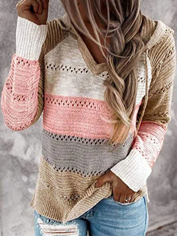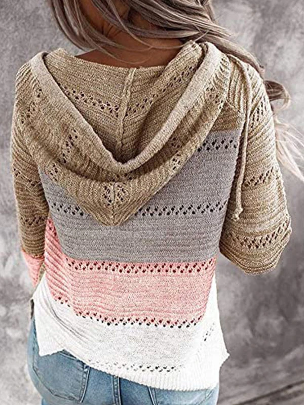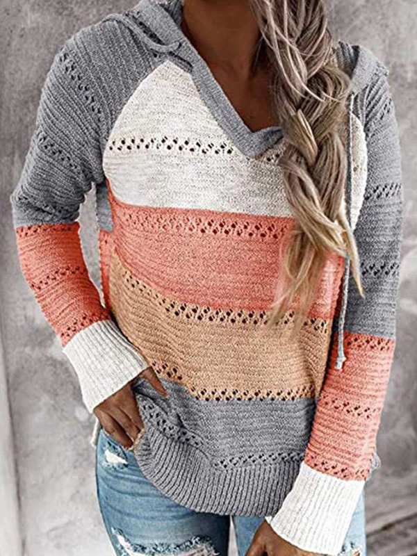 Women Pullover Sweater Grey Hooded Long Sleeves Drawstring Sweaters