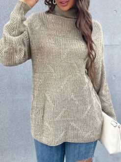 Women Pullover Sweater Khaki Piping High Collar Long Sleeves Oversized Sweaters