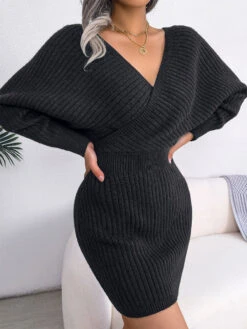 Women’s Knitted Dress Beautiful Acrylic Long Sleeves V-Neck Winter Dresses