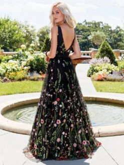 Black Evening Dress A-Line Tulle Front Split Half Sleeves Illusion Neckline Skirt Milanoo