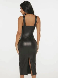 Bodycon Dresses Black Sleeveless Split Front Sexy Square Neck Low-slit Midi Dress Sheath Dress