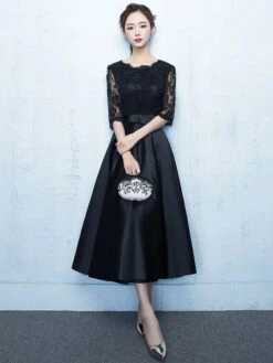 Cocktail Dresses Black Lace Satin Half Sleeve Bows Graduation Party Dress Free Customization